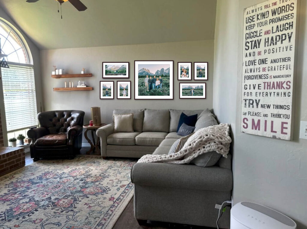The Tetons in the background. Her family together. It’s not tucked away in a cloud folder or saved to a camera roll she’ll scroll past. It’s there, every single day, in the room where this family actually lives.
